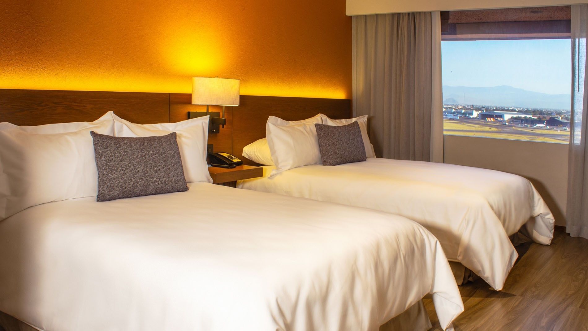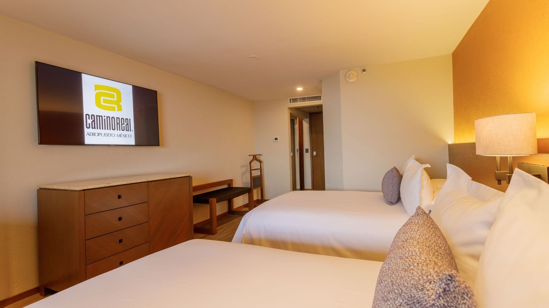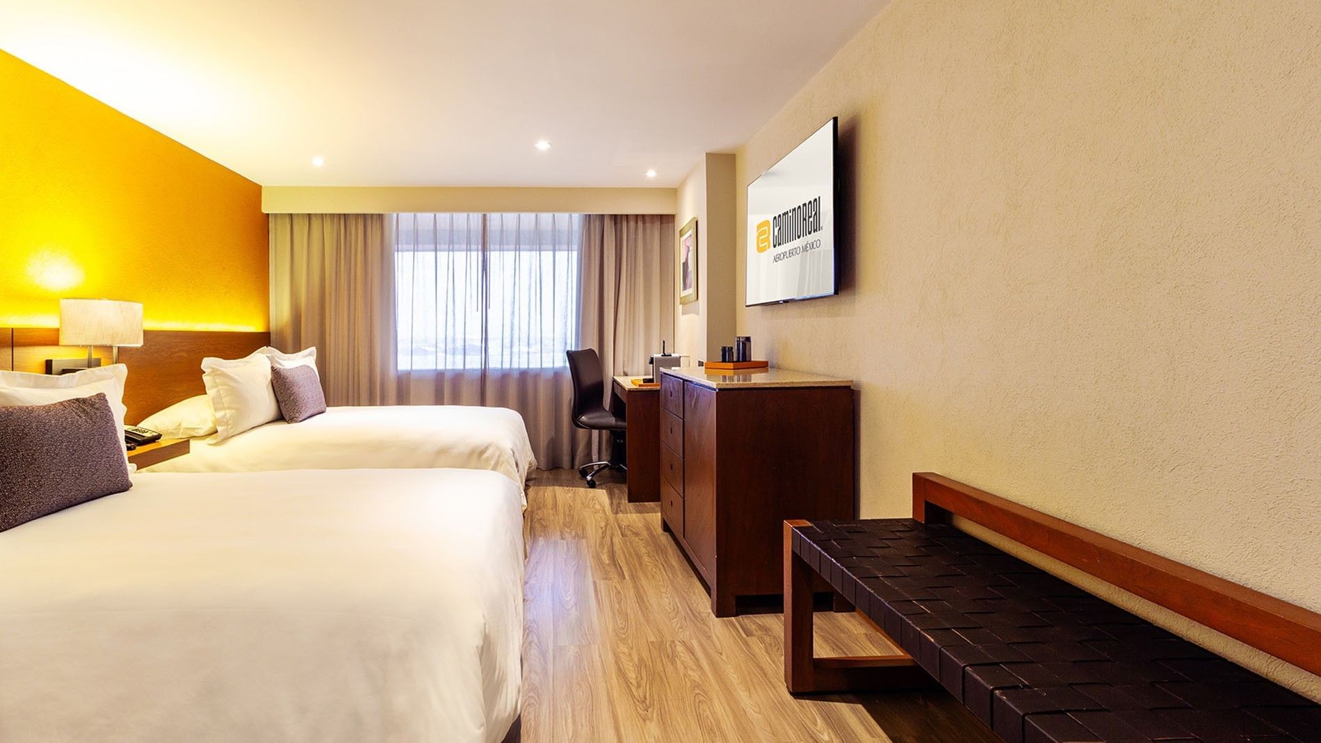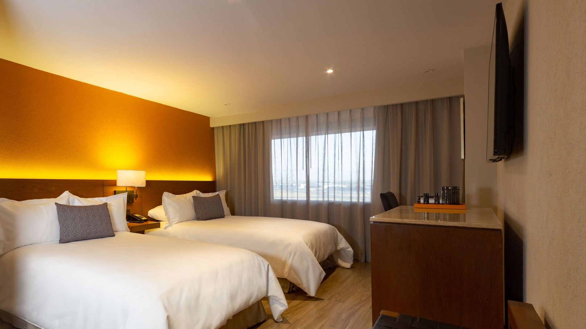 Ideal para familias o amigos que viajan juntos, esta habitación de 27 m2; ofrece dos camas dobles y un diseño pensado para el confort. Cuenta con aire acondicionado, plancha, tabla de planchar, perchero y un amplio escritorio con silla. Los huéspedes disfrutan de caja fuerte digital, Wi-Fi, dos botellas de agua de cortesía y reloj despertador con asistencia de la operadora. Una televisión de pantalla plana de 50" con más de 60 canales garantiza entretenimiento en cualquier momento. El baño está equipado con regadera, secadora de cabello y artículos de cuidado personal gratuitos. En cuanto a seguridad, dispone de detectores de humo, rociadores, mirilla óptica y doble caja de seguridad. Se pueden solicitar camas adicionales con cargo extra, y cunas sin costo, sujetas a disponibilidad.