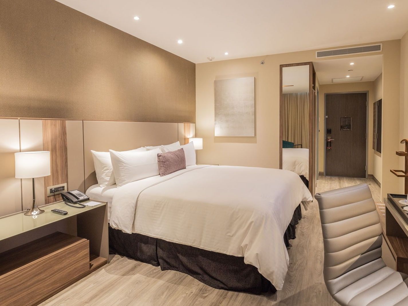 Perfecta para quienes buscan mayor espacio y confort, esta habitación de 31 m2; cuenta con dos camas dobles, aire acondicionado y un práctico espacio de trabajo con silla ejecutiva. Los huéspedes disfrutan de amenidades como cafetera Nespresso, caja fuerte digital y reloj despertador para una estancia aún más cómoda. Para mantenerte conectado, dispone de una televisión de pantalla plana de 50” con canales satelitales, buzón de voz y línea telefónica. El baño moderno incluye regadera, secadora de cabello, espejo para maquillaje y artículos de cuidado personal gratuitos. Una llave de proximidad facilita el acceso, mientras que el sistema de detección de incendios, la mirilla óptica y la doble caja fuerte garantizan seguridad en todo momento. Camas adicionales y cunas están disponibles bajo solicitud.