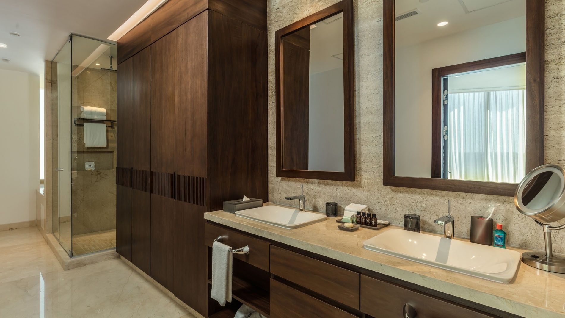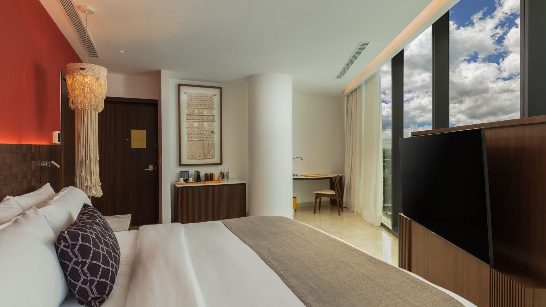 Amplia y sofisticada, esta suite de 51 m2; ofrece una cama King Size y comodidades refinadas. Cuenta con aire acondicionado, calefacción, clóset, plancha y tabla de planchar para tu conveniencia, además de minibar, caja fuerte digital y Wi-Fi gratuito que elevan tu estancia. Disfruta entretenimiento premium en una Smart TV de 60 pulgadas con 60 canales en HD. El baño está equipado con regadera, secadora de cabello y espejo para maquillaje. Los sistemas contra incendios y la mirilla óptica brindan seguridad, con la posibilidad de solicitar camas adicionales o cunas según disponibilidad.