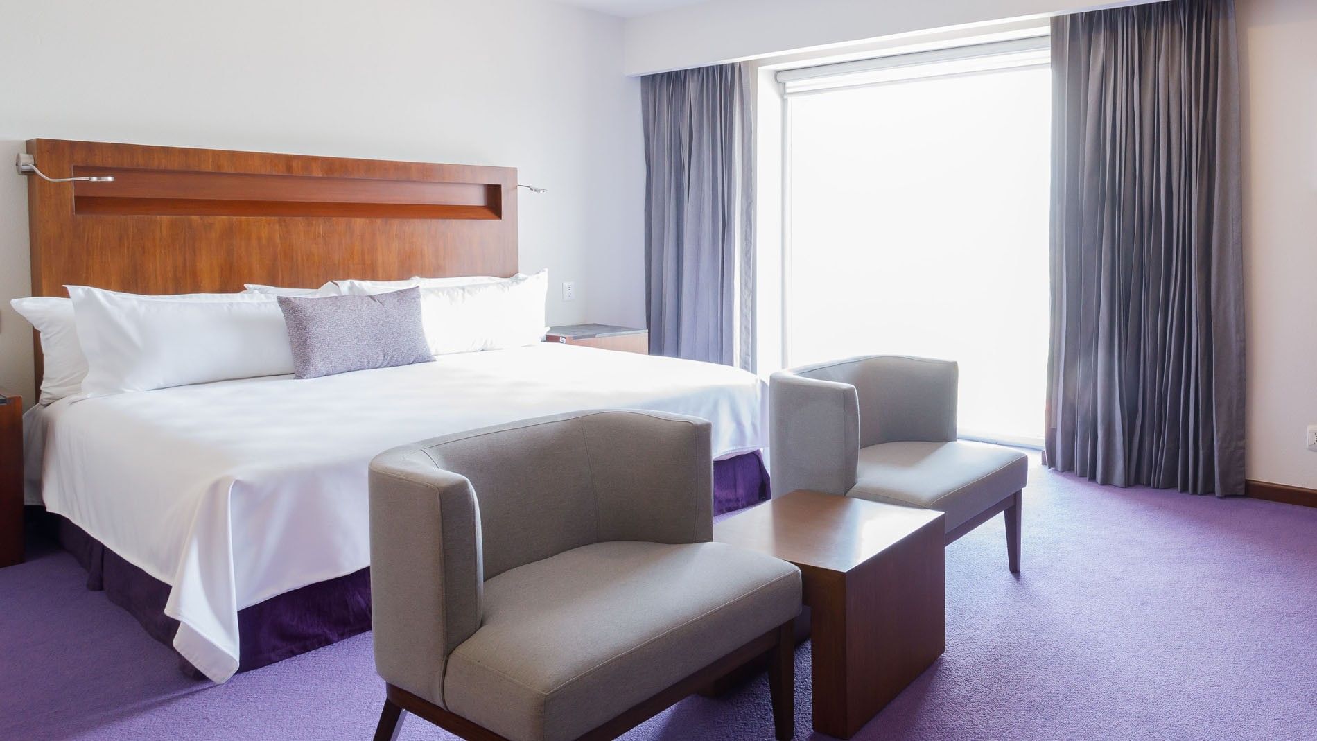 Esta suite de 42 m2; cuenta con una cama King Size, un amplio escritorio ejecutivo y minibar. Incluye desayuno americano, Wi-Fi y un baño de lujo con regadera, secadora de cabello y bata. Ofrece un ambiente cómodo y seguro, con modernas amenidades y caja fuerte digital.