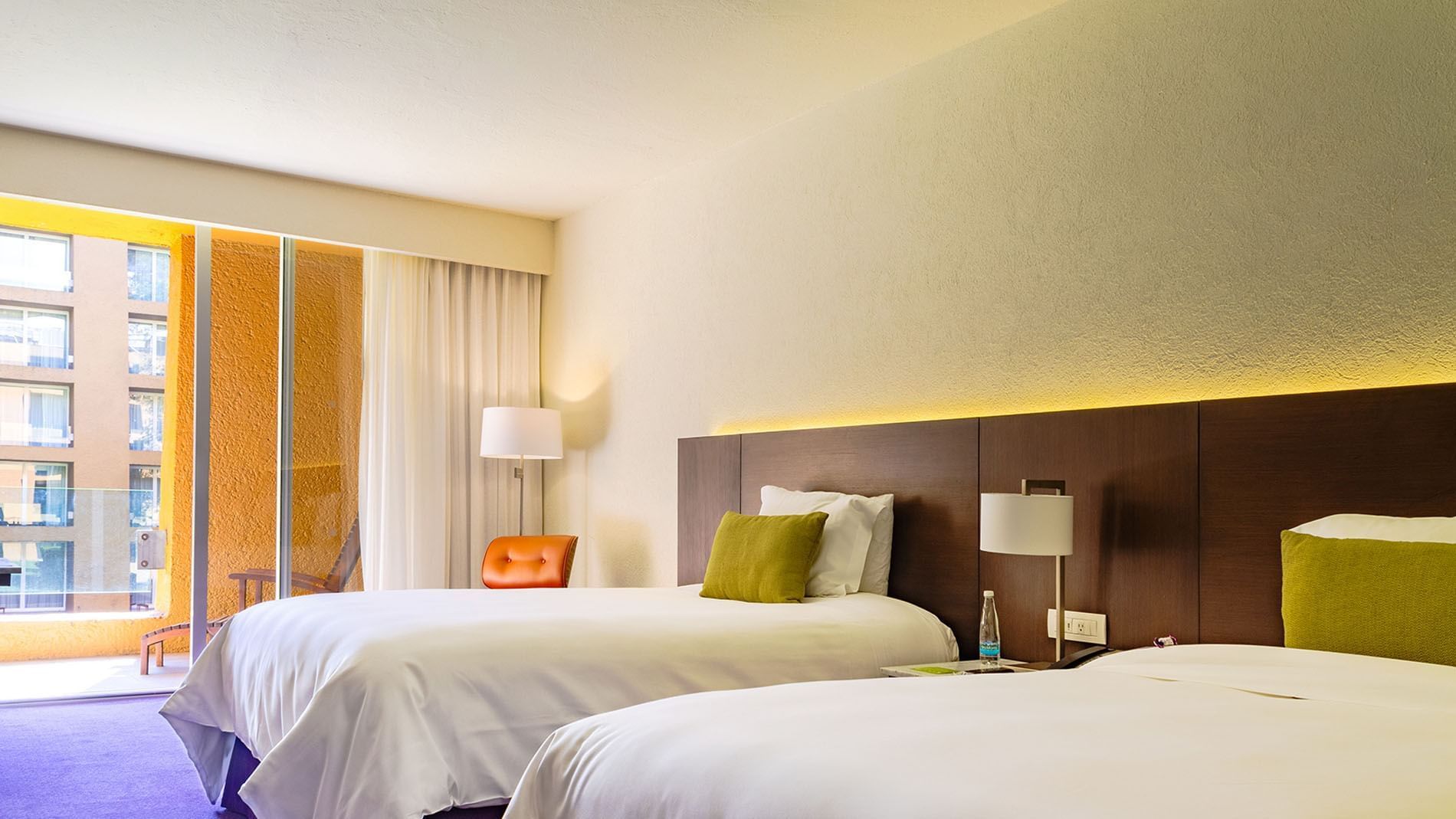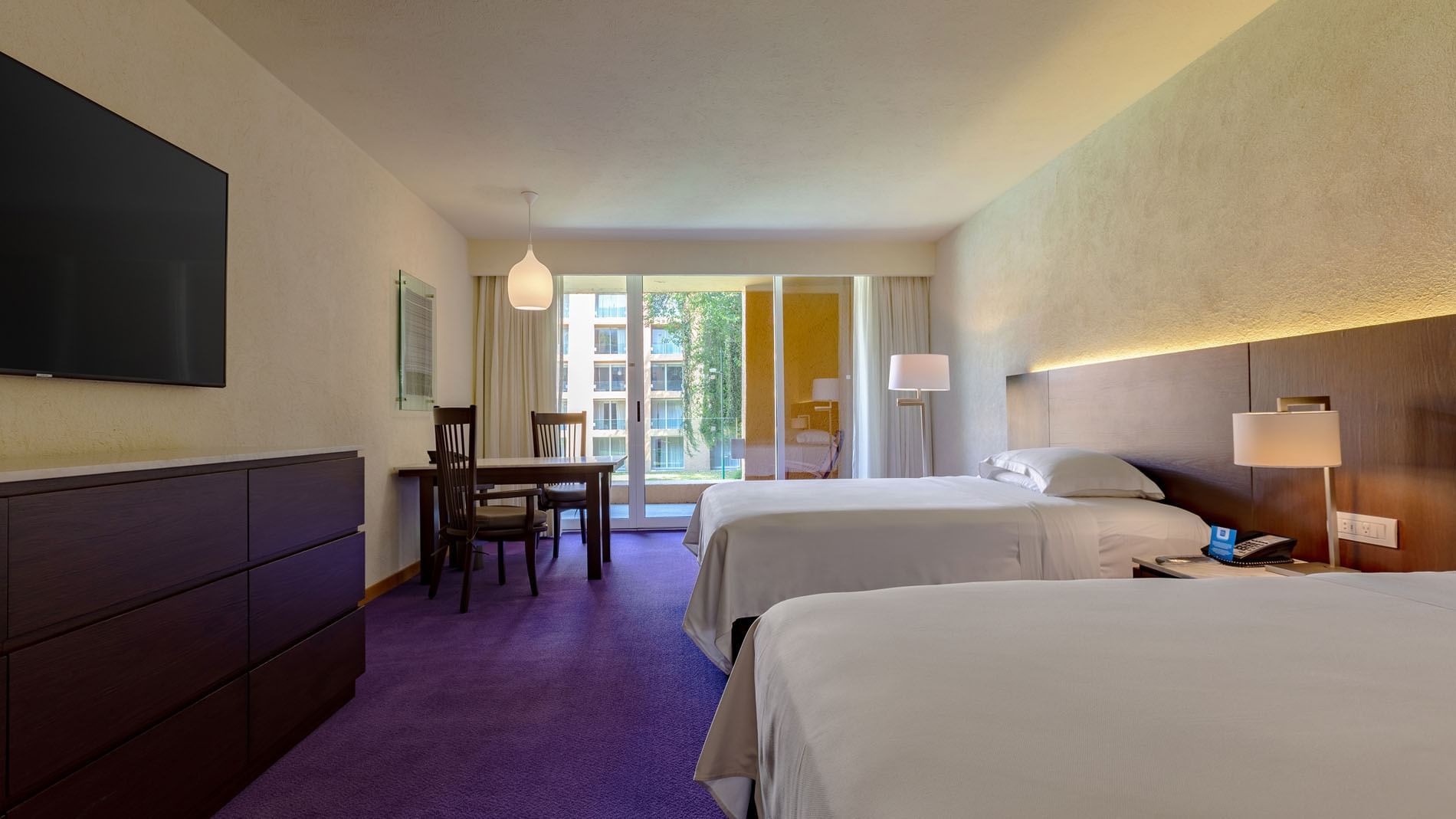Esta amplia habitación de 42 m2; con dos camas dobles, siendo perfecta tanto para trabajar como para relajarte. Cuenta con aire acondicionado, clóset, plancha, tabla de planchar y un escritorio con silla ejecutiva.