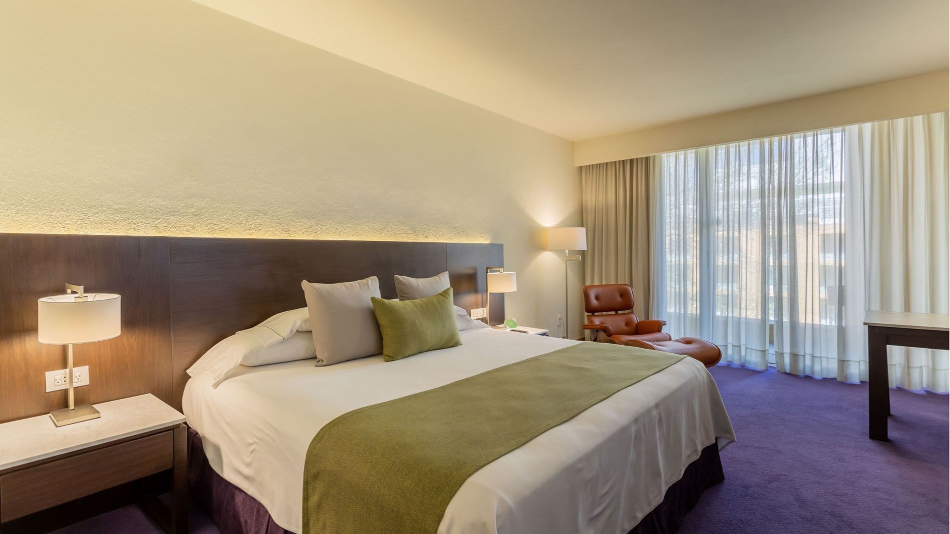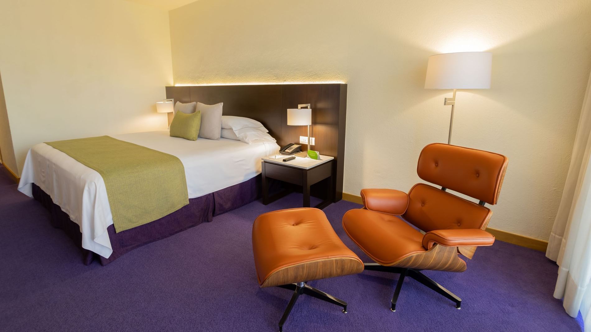 Esta amplia habitación de 42 m2; ofrece una cómoda cama King. Diseñada para combinar trabajo y descanso, cuenta con aire acondicionado, clóset, plancha, tabla de planchar y un escritorio con silla ejecutiva.