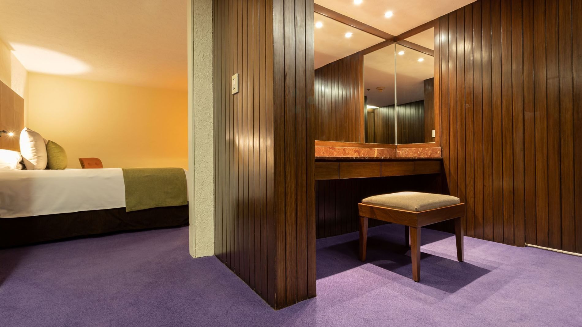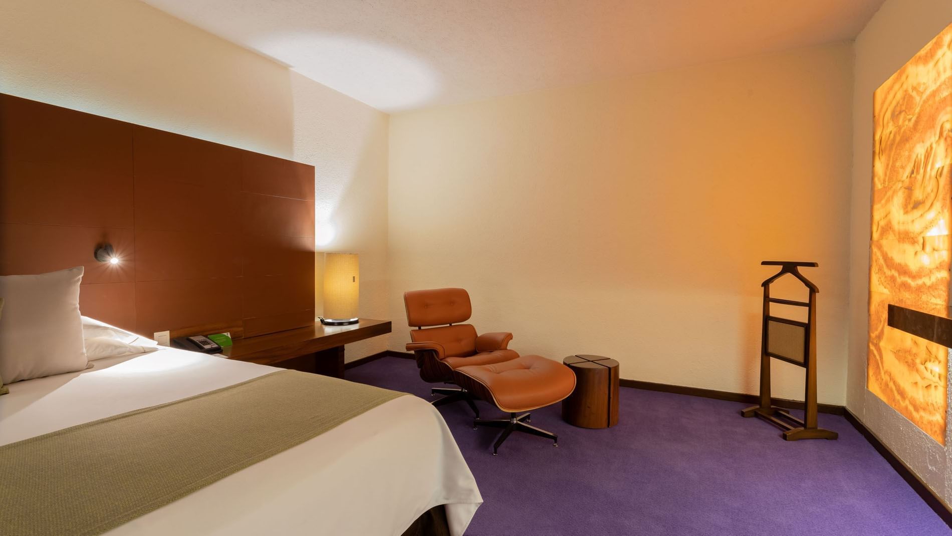 Esta amplia habitación de 42 m2; ofrece una cómoda cama King. Diseñada para combinar trabajo y descanso, cuenta con aire acondicionado, clóset, plancha, tabla de planchar y un escritorio con silla ejecutiva.