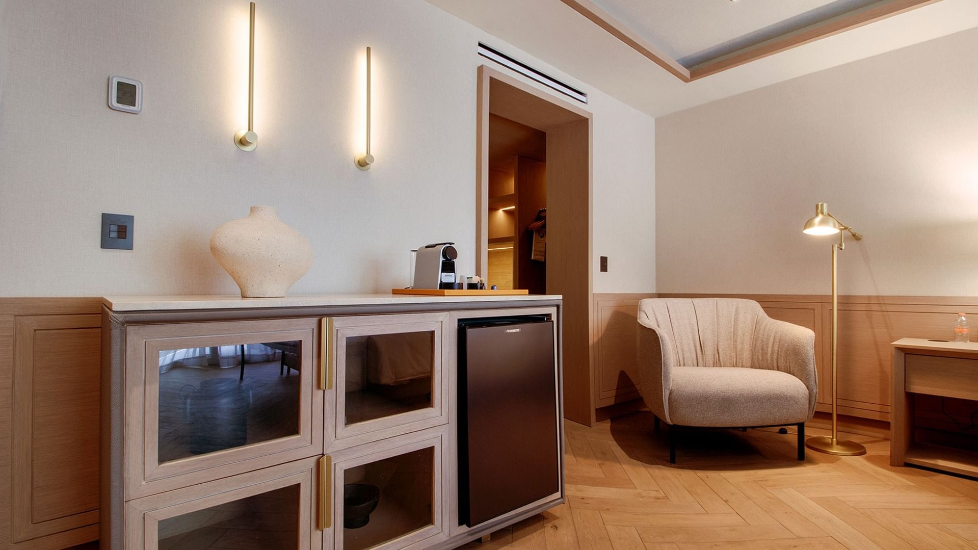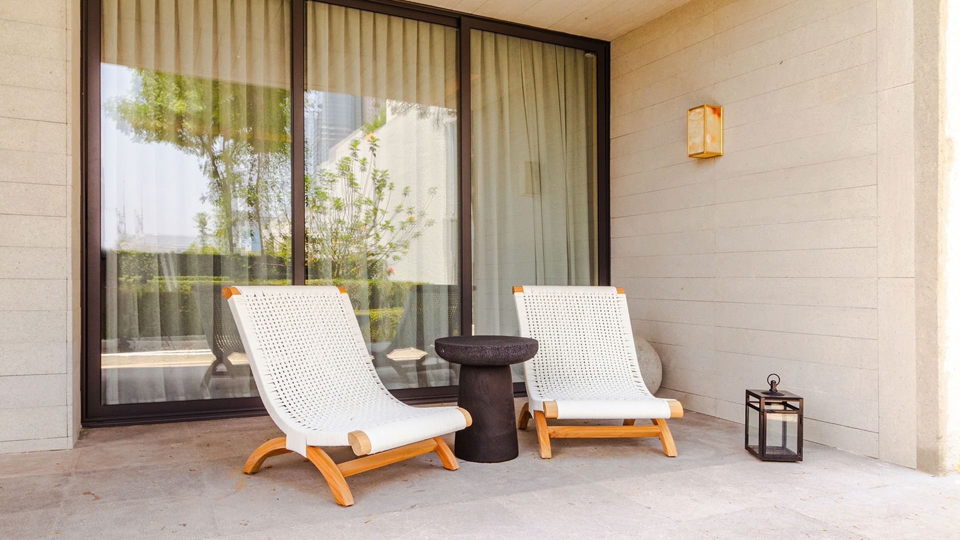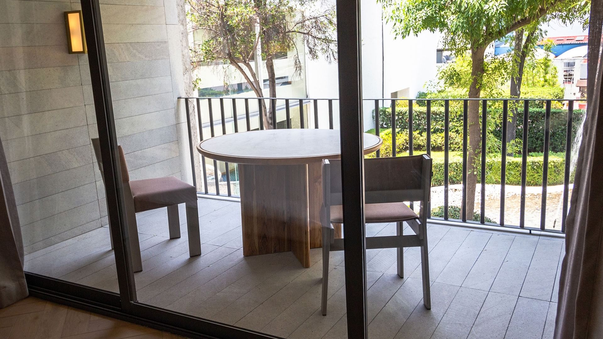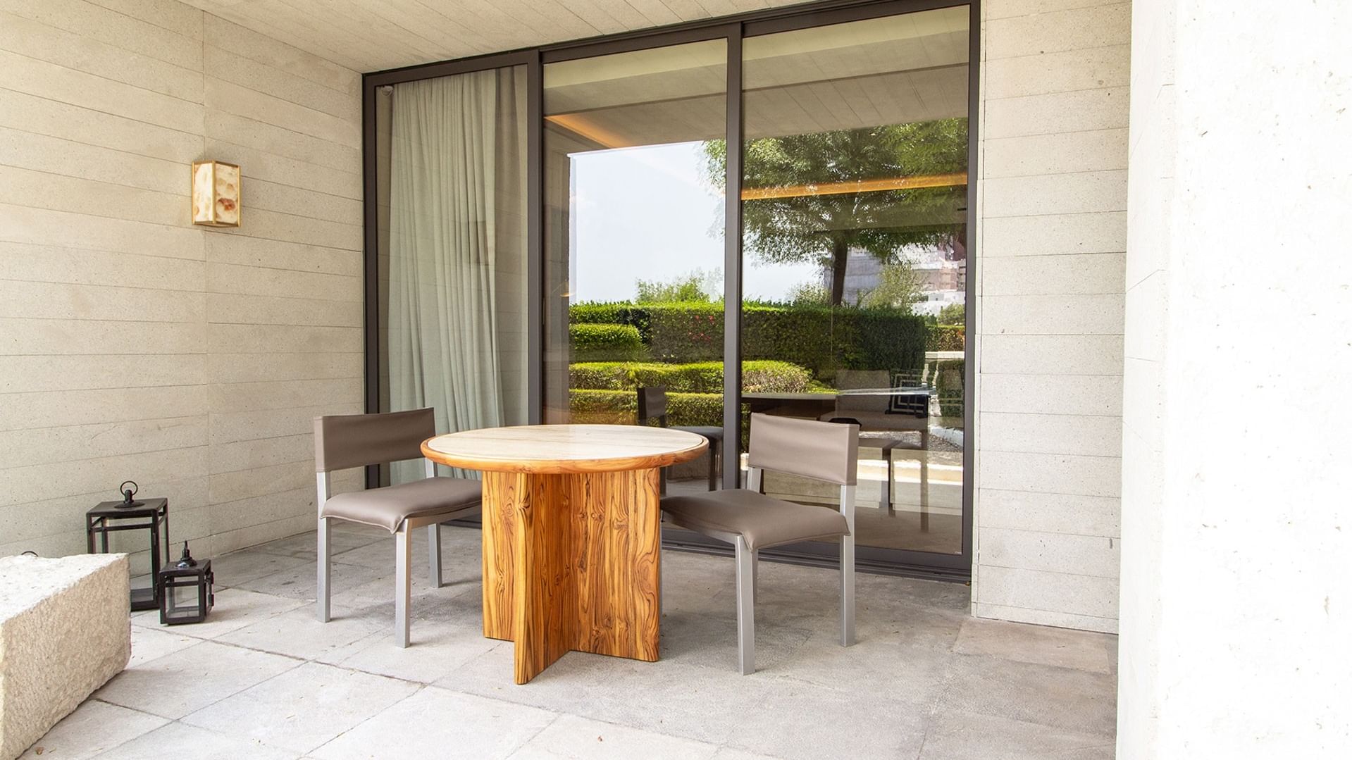 La Master Suite de 112 m2; ofrece un espacio amplio y lujoso, que incluye una terraza privada con vistas al jardín interior. Diseñada para quienes aprecian lo mejor del lujo, cuenta con aire acondicionado, clóset, chaise longue y un escritorio con silla ejecutiva, además de cafetera para tu comodidad.