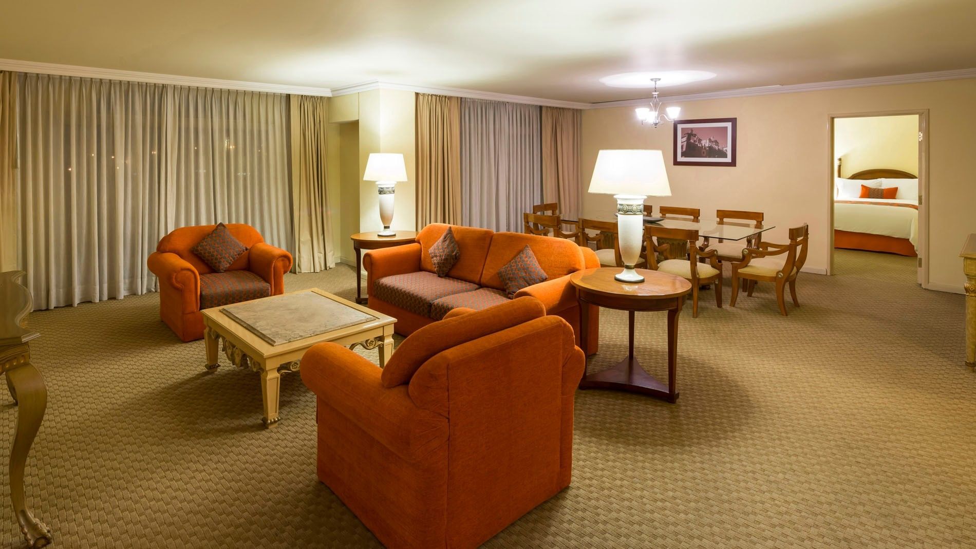 El máximo lujo y amplitud se encuentran en la Suite Presidencial, que abarca 104 m2; con dos habitaciones: una con cama king size y otra con cama doble. Con vistas al campo de golf, esta amplia suite incluye sala de estar, comedor y cocina completamente equipada con refrigerador, estufa eléctrica y microondas. Tres televisores de 55 pulgadas, dos líneas telefónicas y caja fuerte digital ofrecen comodidades modernas. La suite cuenta con dos baños completos con regadera y tina, además de un baño para visitas.