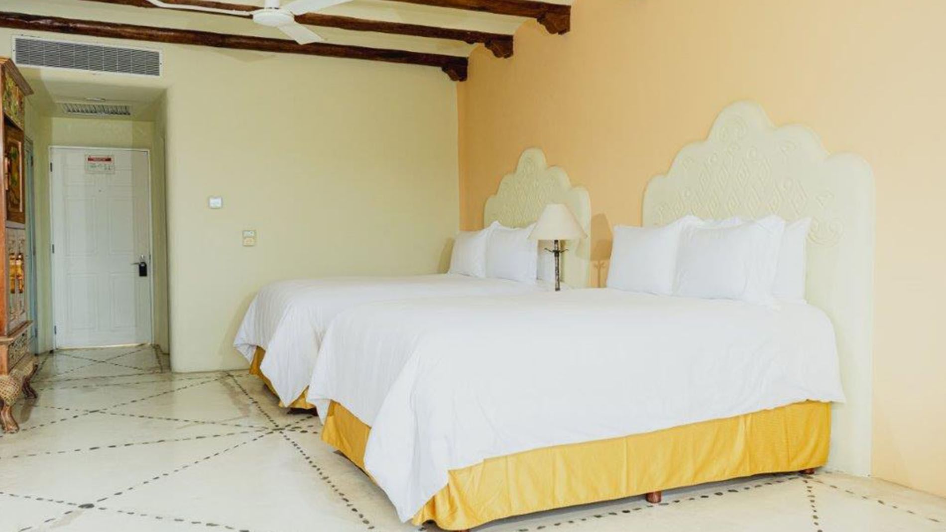 Suite de 73 m2 con dos camas matrimoniales y una amplia terraza con vista al mar y hamaca, ideal para relajarse al ritmo de la brisa. Con una fusión de influencias mexicanas y marroquíes, esta suite destaca por su decoración artesanal, muebles en maderas nobles y texturas envolventes. Diseñada para brindar confort absoluto, cuenta con aire acondicionado, ventilador de techo, sofá, minibar y caja fuerte digital. Para tu entretenimiento y conectividad, incluye televisión de pantalla plana con canales vía satélite y dos líneas telefónicas directas. El baño, con acabados en mármol, ofrece tina de hidromasaje, amenidades premium, batas, pantuflas y secadora de cabello. También incluye sistema contra incendios, mirilla con cerradura doble, opción de camas adicionales con costo extra y cunas sin costo, sujetas a disponibilidad.