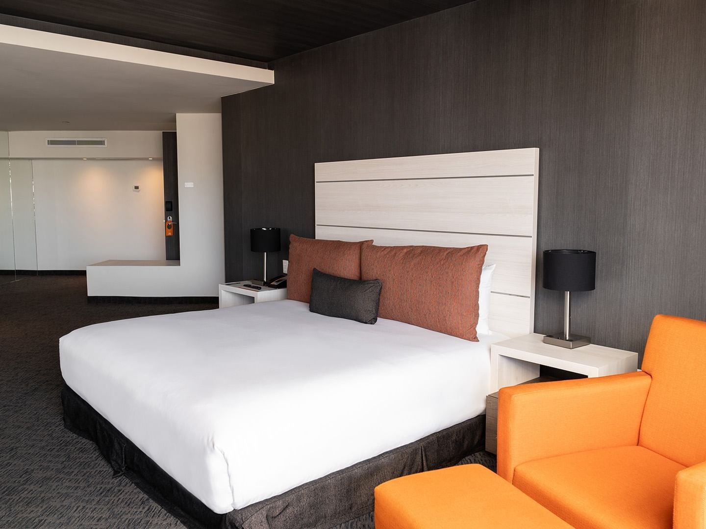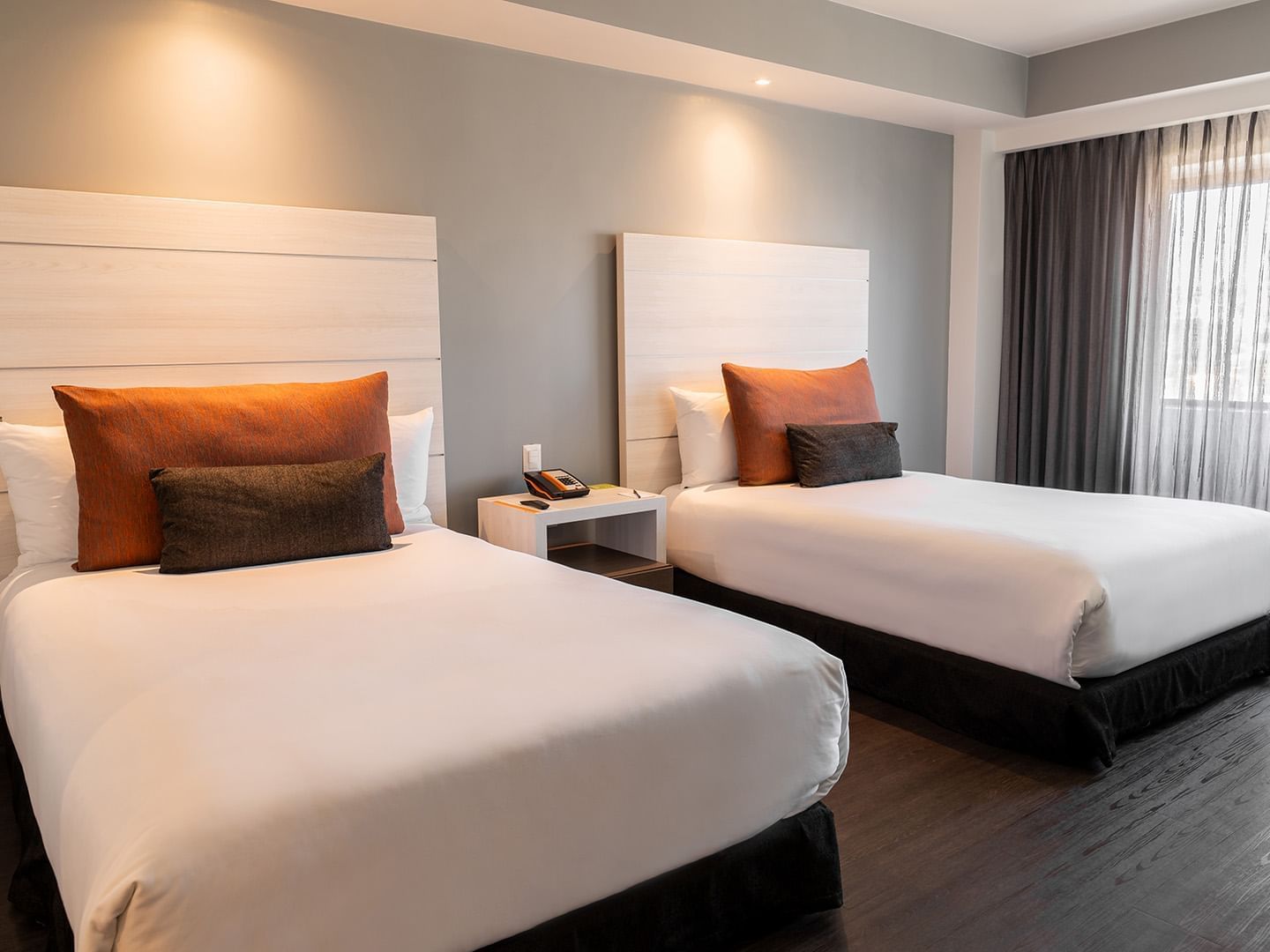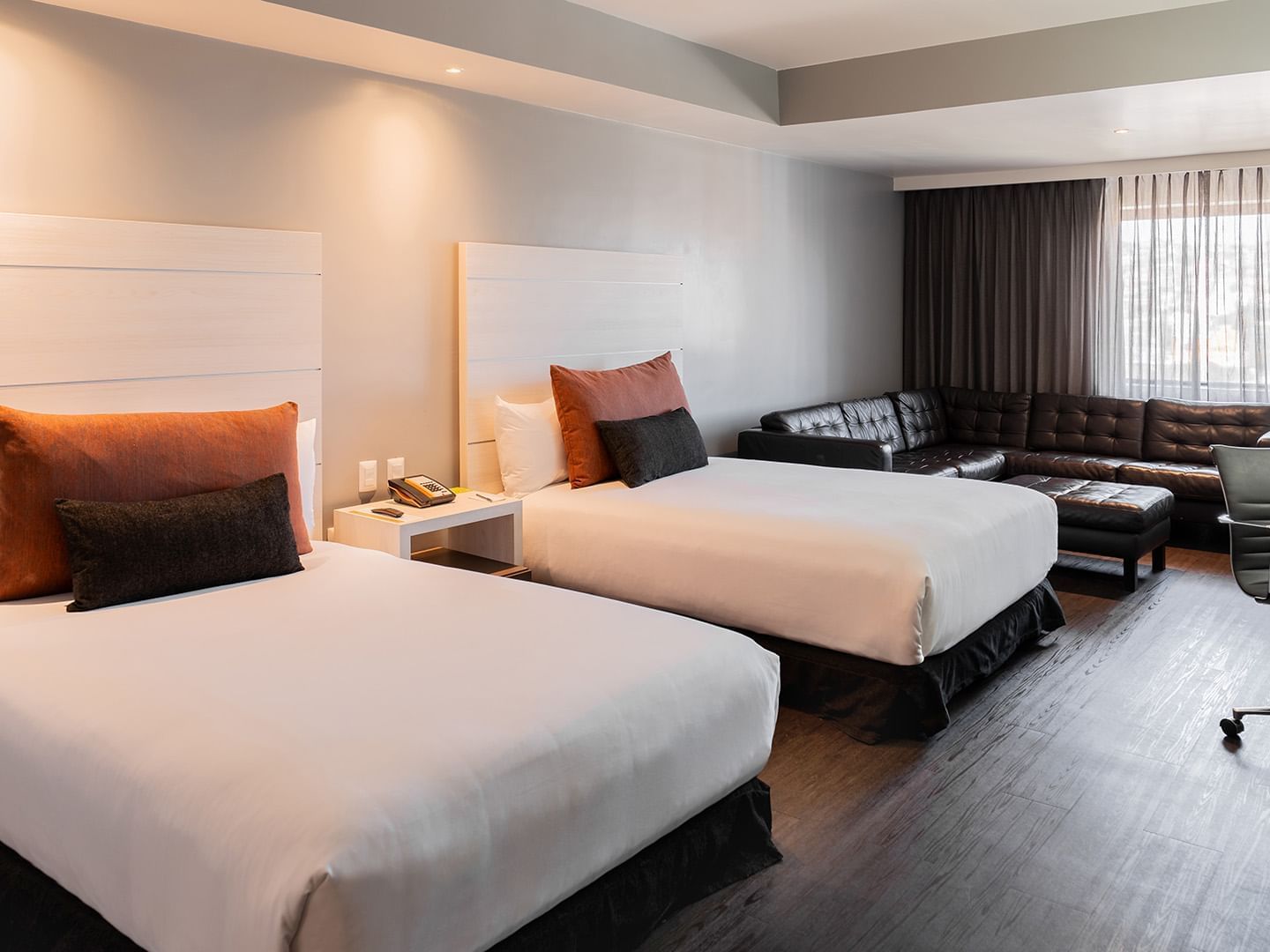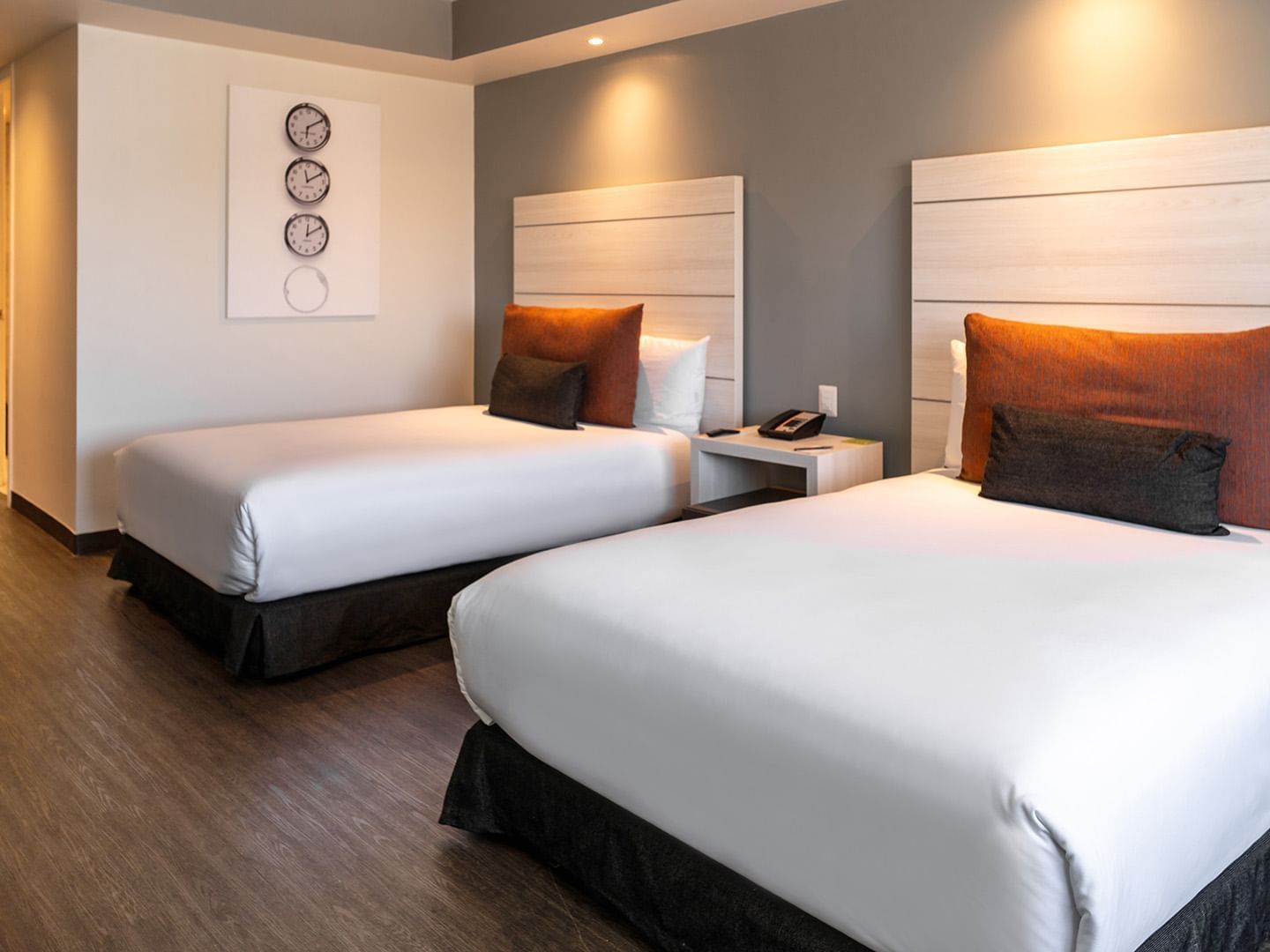 Amplia habitación de 35 m2 con dos camas dobles y acceso exclusivo al Lounge ubicado en el piso ejecutivo. Diseñada para viajes de negocios o descanso, cuenta con aire acondicionado, caja fuerte digital y televisión de pantalla plana de 46 pulgadas con señal satelital. El baño ofrece regadera con efecto lluvia, amenidades de lujo, pantuflas y bata. Para tu tranquilidad, incluye sistema contra incendios y doble caja fuerte. Cama adicional y cunas disponibles bajo solicitud.