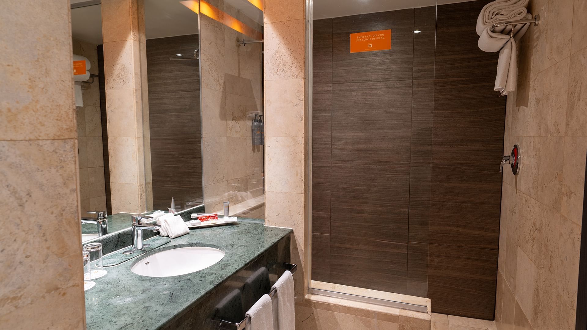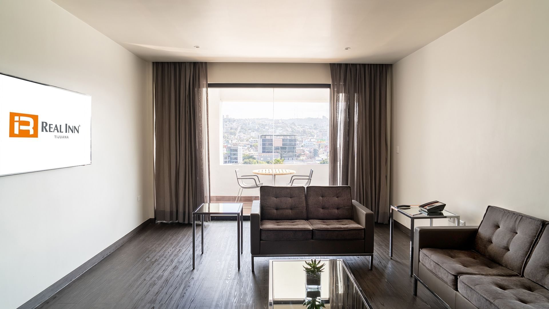 Elegante suite de 64 m2 con cama King Size, balcón privado y espectaculares vistas a la ciudad. Diseñada para brindar máximo confort, cuenta con amplia sala y comedor, caja fuerte digital y televisión de pantalla plana de 46 pulgadas con señal satelital. El baño incluye regadera con efecto lluvia, amenidades premium, pantuflas y bata. Para tu tranquilidad, la suite está equipada con sistema contra incendios y doble caja fuerte.
