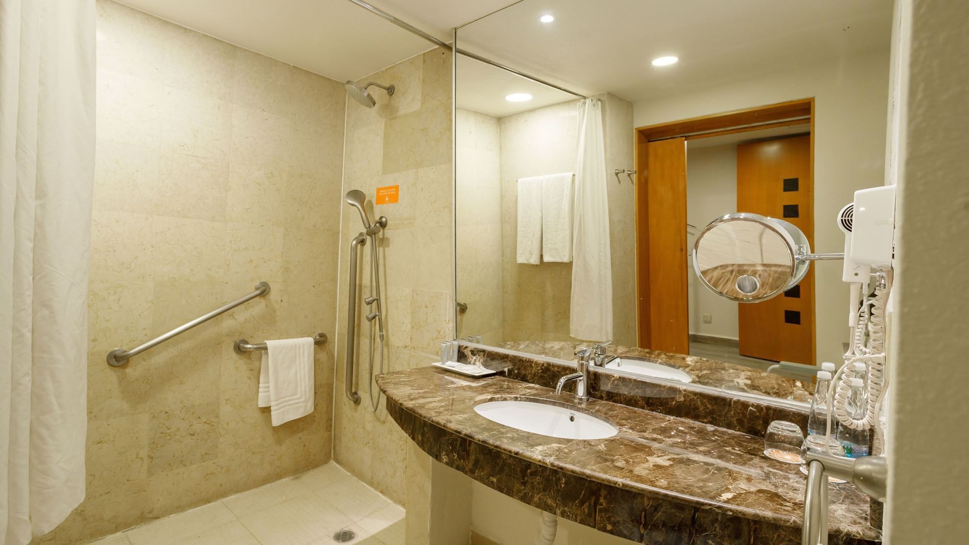 Pensada especialmente para brindar accesibilidad sin renunciar al confort, esta habitación de 26 m2; cuenta con una cama doble y vistas al boulevard, la alberca o el jardín. Está equipada con aire acondicionado, caja fuerte digital, clóset, plancha, tabla para planchar y escritorio con silla ejecutiva. Disfruta de una televisión de pantalla plana de 32 pulgadas con señal satelital, línea telefónica y buzón de voz. El baño accesible incluye regadera, secadora de cabello, espejo de aumento y artículos de higiene personal sin costo. La habitación está equipada con sistema contra incendios, detectores de humo, aspersores y doble caja fuerte. El horario de Check-in es a las 15:00 h y el de Check-out a las 13:00 h. Cama adicional disponible con costo extra; cunas gratuitas sujetas a disponibilidad.